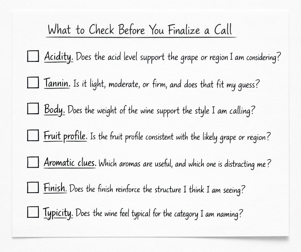 - check structure (compare acidity, tannin, body, fruit profile, aromatic clues, finish, and typicity) before locking in a call